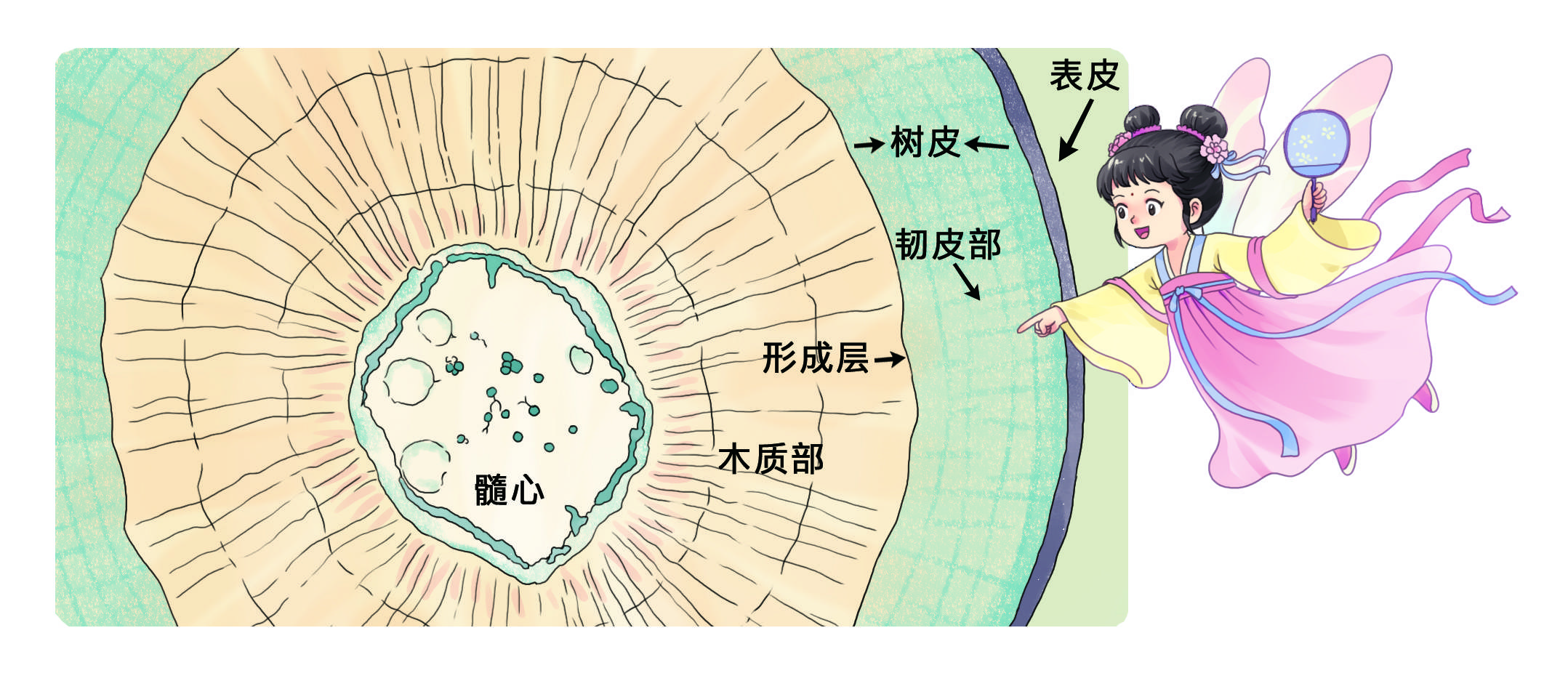 从外到内,最外层是表皮,然后是略为柔软的韧皮部,再里面是坚硬的木质部。在韧皮部和木质部之间,还有一个薄层——形成层。形成层的细胞能不断地侧向分裂、增生 , 其中大部分细胞向内形成木质部 , 少量细胞向外形成韧皮部 , 从而使得树干不断地生长、加粗。韧皮部的筛管负责将叶片中光合作用的产物输送到植物的各部分,其中糖类占 90% 以上,其余是蛋白质、维生素、无机盐和激素等。木质部的导管则负责将根部吸收到的水和无机盐运送到植物的各部分。