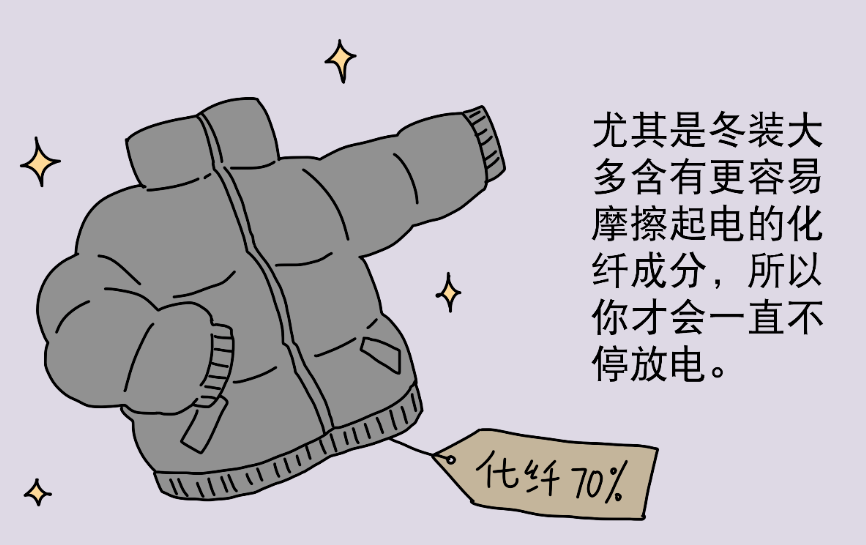 看见没?合成纤维就是静电的“铁杆盟友”,天然纤维相对佛系。但世界上不存在绝对没有静电的面料,在特别干燥和低温的情况下,棉和麻也是有可能产生静电的,所以别以为穿羊毛和真丝就可以高枕无忧了,天干物燥的时候,它照样电得你一激灵。