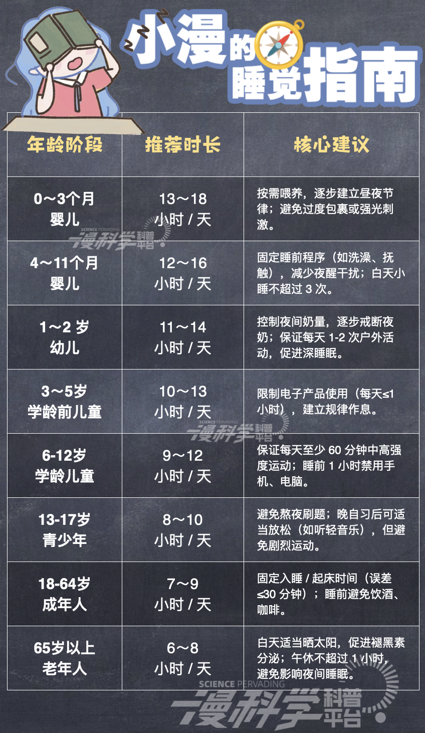 中国睡眠研究会研究中,不同年龄段所需的睡眠时间。