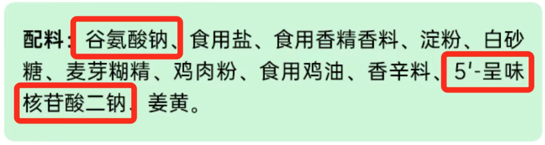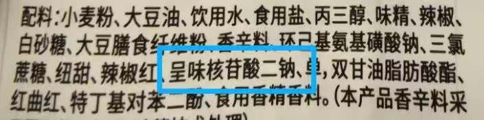 在我国,呈味核苷酸二钠被列入《食品安全国家标准 食品添加剂使用标准》(GB 2760),允许在各类食品中“按生产需要适量使用”[6]。因为本身具有极强的鲜味,少量添加即可达到所需效果,过量反而会影响风味。所以,呈味核苷酸二钠在食品中的添加量通常非常低,用多了反而味道会变差。(看看食品里配料表的位置就知道了↓↓↓)