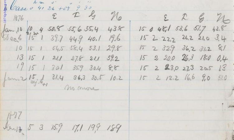 1881年,皮克林正式聘请弗莱明到天文台担任计算员,负责记录恒星的测光数据。根据“保存哈佛早期天文数据与研究”(Preserving Harvard’s Early Data and Research in Astronomy,PHAEDRA)项目发现的笔记本,弗莱明入职后登记的最早数据是1876年的一些观测。