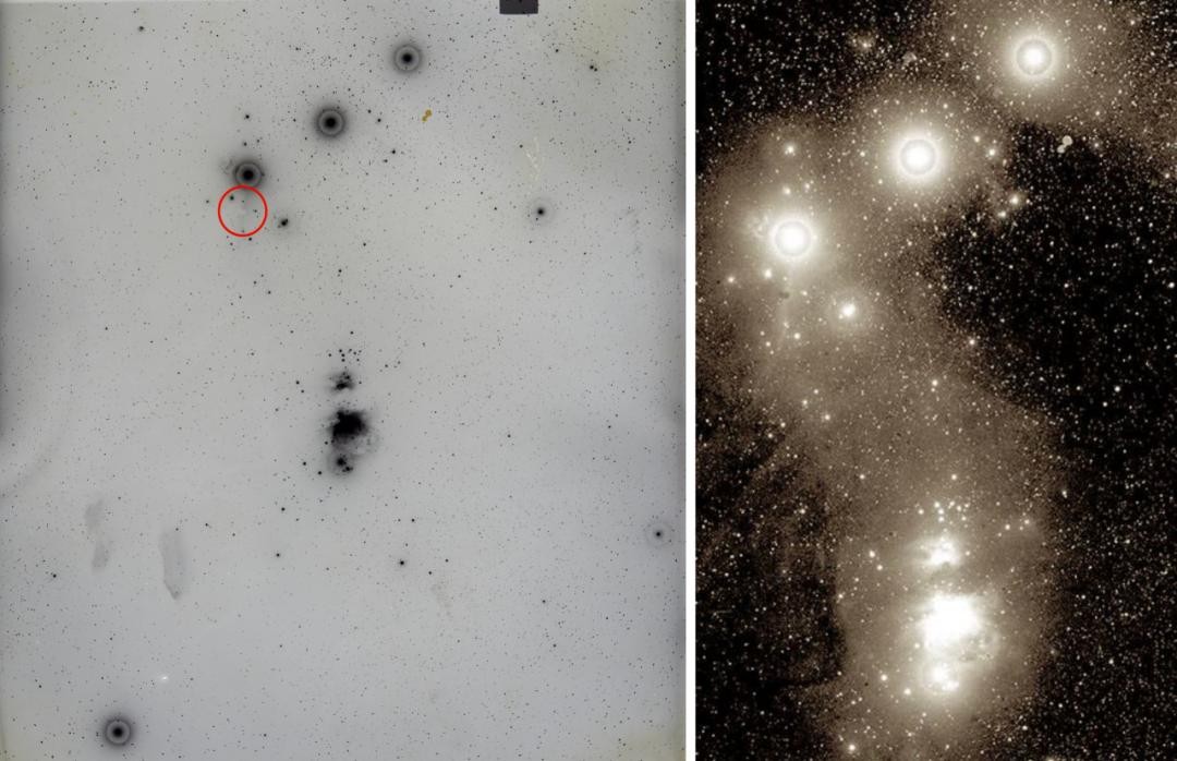 左:编号为B2312的照相底片,弗莱明从中发现了马头星云,即图中红圈内的白斑。右:另一张马头星云照片(右),此图中被曝光区域显示为白色,因此更容易识别出微小的马头星云(左边最亮星下方向右凸起的部分)。图源:Harvard College Observatory(左);NASA, ESA, and the Hubble Heritage Team (AURA/STScI)(DASCH at Harvard)