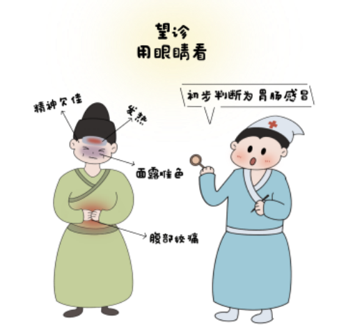望诊,包括观察形体、精神状态、面色、舌头、排出物等,通过观察患者的外在表现来推断体内的病理变化。即《黄帝内经》中所言:“视其外应,以知其内藏,则知所病矣。”