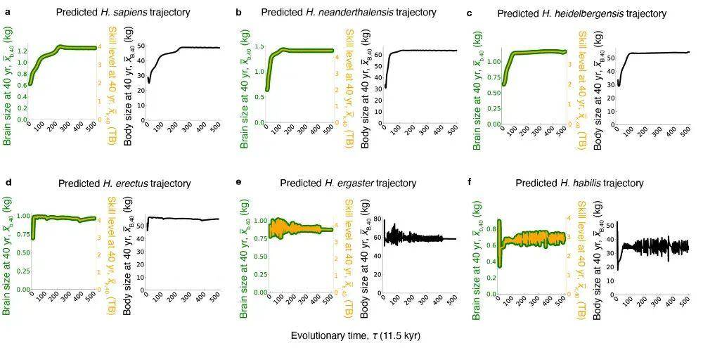 人类脑容量、体重与技能水平在数百万年进化过程中的变化趋势。脑容量在进化历史中先快速增长,随后略有回落;体重与脑容量同步上升;技能水平则随脑容量逐渐累积,呈现出远比脑体更平滑的增长轨迹。