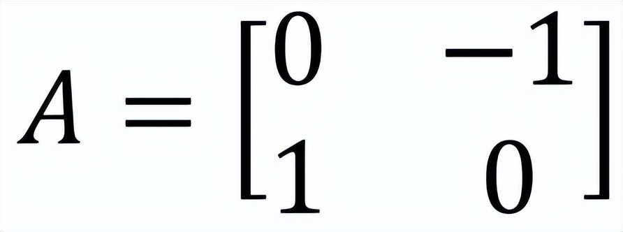 设想我们把𝑥𝑦 −平面上的每个向量都围绕坐标原点按逆时针方向旋转90度。这是将𝑅^2映到𝑅^2上的一个线性算子。因为每个非零向量都旋转了一个直角,故它们当中不可能有向量旋转成同一方向或相反方向的向量,所以这个实域上的旋转算子不存在实特征值,在几何上看是显而易见的。若用代数的方法解释这个现象,不用高中平面解析几何的坐标旋转公式,而用我们一直提倡的算子思想,很容易写出该旋转所对应的2阶方阵:这个90度的旋转将向量(1, 0)旋转到向量(0, 1),而把向量(0, 1) 旋转到向量(−1, 0)。因而这个旋转算子由矩阵