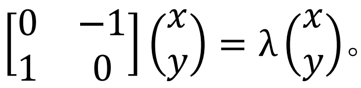 上述方程等价于联立线性方程组−𝑦 = λ𝑥和𝑥 = 𝜆𝑦。由此得𝑥 = −𝜆^2𝑥。若𝑥 ≠ 0,则𝜆^2 + 1 = 0,它在实数范围内没有解。若𝑥 = 0,因(𝑥, 𝑦) ≠ (0, 0),则𝑦 ≠0。同样的代换逻辑用在𝑦上(𝑦 = −𝜆^2𝑦),也导出𝜆^2 + 1 = 0。所以上述旋转矩阵𝐴在实数域内不存在特征值,自然也没有对应的特征向量了。