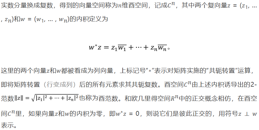 所以,从现在开始,我们在复数域上研究矩阵特征值问题。令𝐴为一个𝑛阶复方阵,即𝐴的每个元素都是复数。自然每一个实矩阵也是复矩阵。将𝑛维欧几里得空间𝑅^𝑛中的实向量的每个
