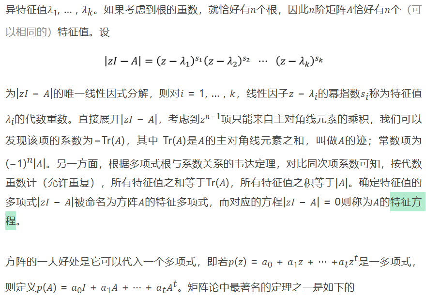上面对三阶矩阵的结论可以直接推广到𝑛阶矩阵𝐴。此时,由行列式的经典定义或等价的按行或按列拉普拉斯展开计算公式,易见行列式|𝑧𝐼 − 𝐴|展开后是变量𝑧的𝑛阶复系数多项式,故根据代数基本定理,多项式方程|𝑧𝐼 − 𝐴| = 0至多有𝑛个相异复数根,它们就是𝐴的所有相