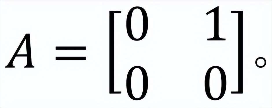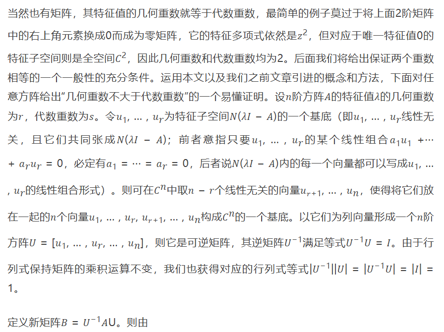 故𝐴仅有一个相异特征值0,其代数重数为2。为了得到0的几何重数,我们求解方程对应于特征值0的特征向量方程组(0𝐼 − 𝐴)𝑦 = 0,所得到的特征子空间𝑁(0𝐼 − 𝐴)是𝐶^2的一维子空间{(𝑥, 0): 𝑥 ∈ 𝐶}。故特征值0的几何重数等于1,它确实小于代数重数2。
