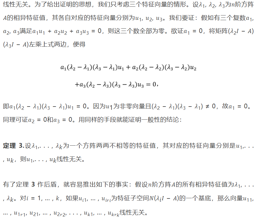我们继续讨论特征值的基本性质。首先我们证明,对应于给定方阵不同特征值的特征向量