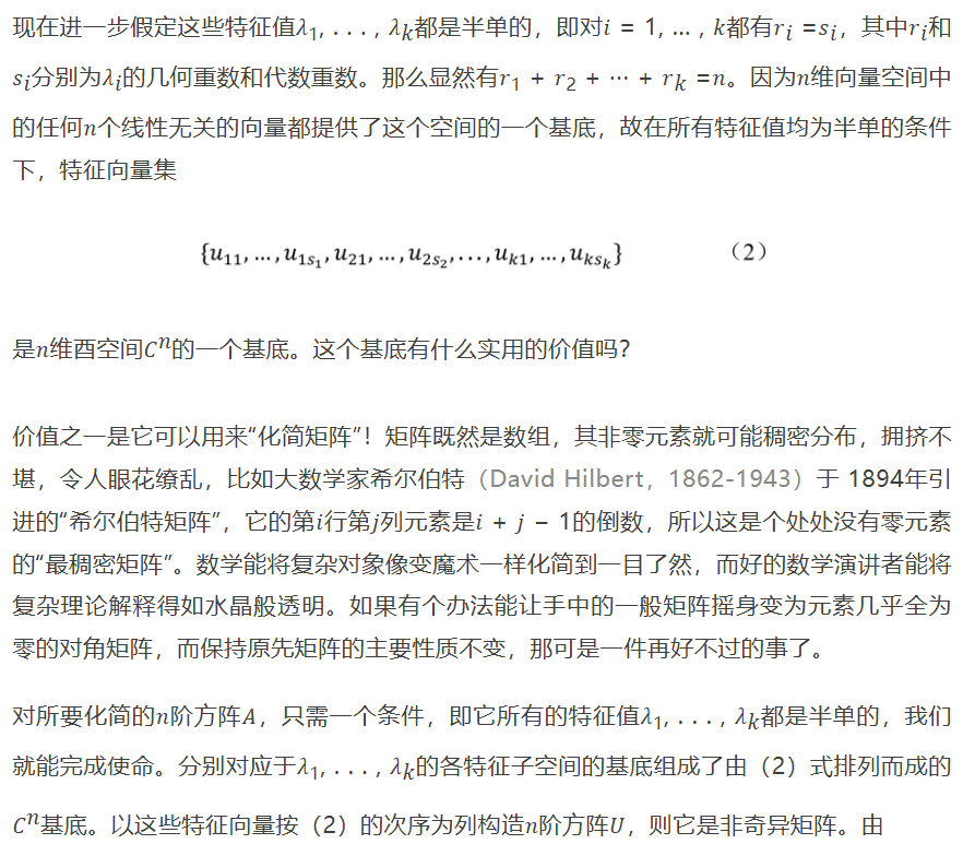 当矩阵的特征值具有相等的代数重数和几何重数时,我们称这个特征值是半单的,特别地,如果代数重数等于1(此时几何重数也必定等于1,因为特征子空间至少是一维的向量空间),则说此特征值是单的。我们在文章的后面部分将给出半单特征值在“简化”矩阵结构的行动中所起的关键作用。
