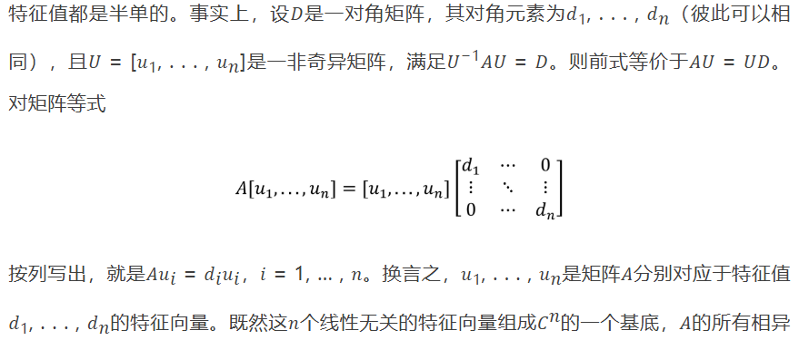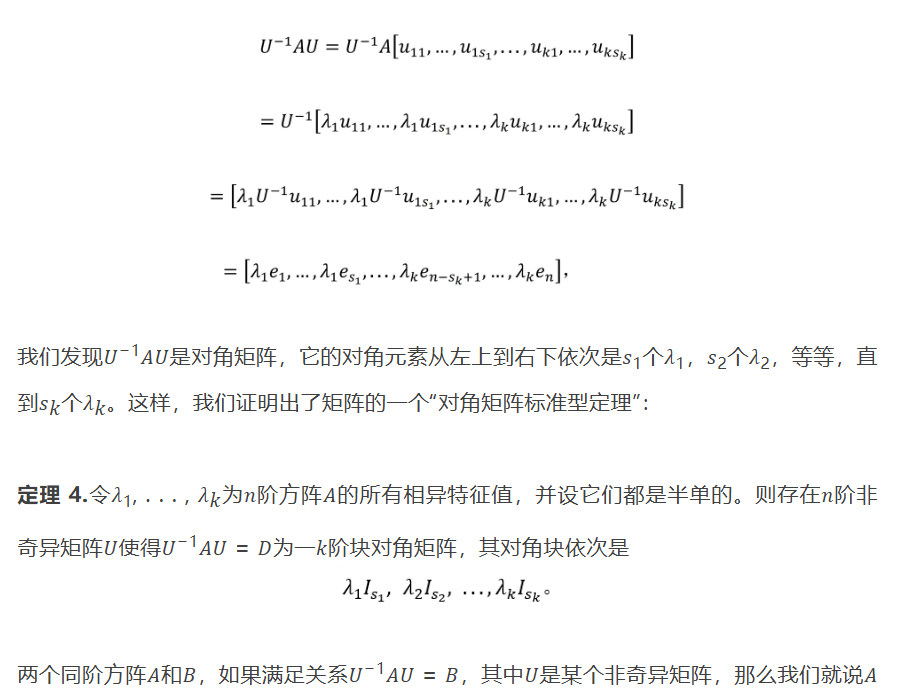 与𝐵是“相似”的,有时如同中学平面几何教科书上表示两个三角形相似的符号那样写成𝐴 ∼ 𝐵。定理 4表明,所有其特征值均为半单的矩阵相似于一个对角矩阵,它的对角元素由这些特征值按各自的重数一一排列。一个特殊的情形是,𝑛阶矩阵𝐴有𝑛个相异的特征值,这时𝐴一定相似于某个对角矩阵。
