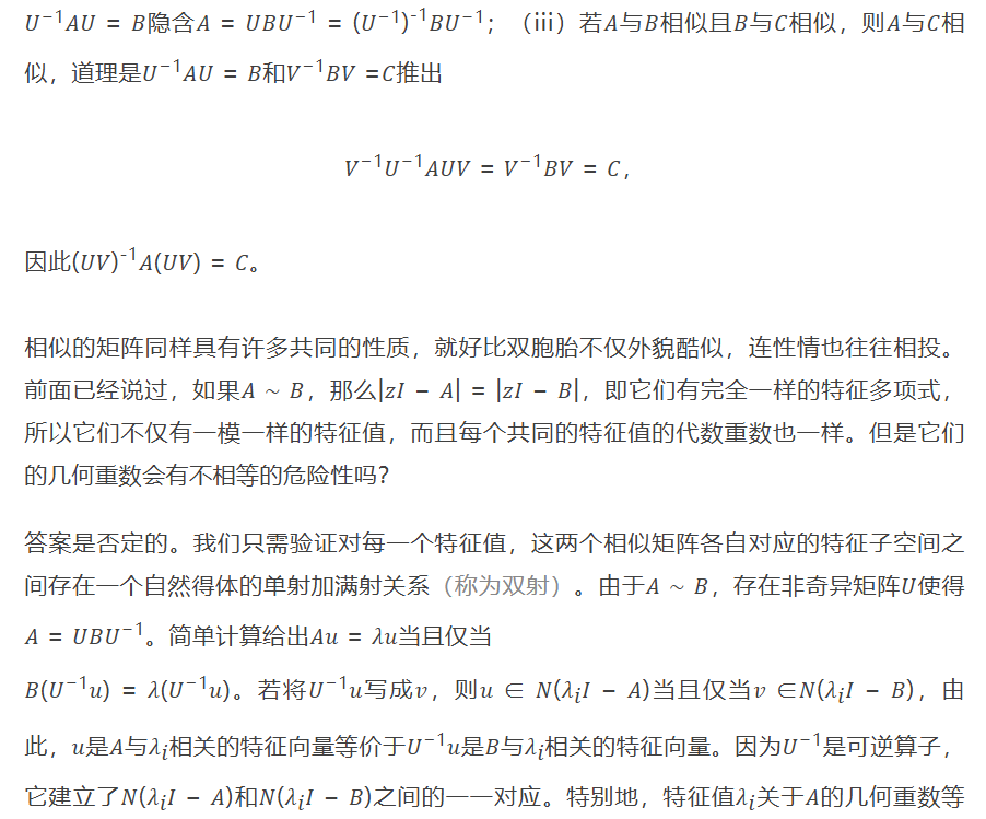 与三角形一样,矩阵之间的相似关系是个“等价关系”,即(i)每个方阵与它自己相似,这时建立相似关系的矩阵𝑈就可取为单位矩阵;(ii)若𝐴与𝐵相似,则𝐵与𝐴相似,这是因为