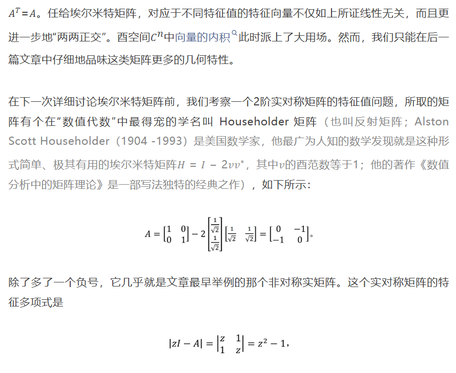 有了这个例子垫底,未来我们就可以深入探讨实对称矩阵、埃尔米特矩阵、正交矩阵、酉矩阵,乃至更加一般的正规矩阵的特征值问题了。