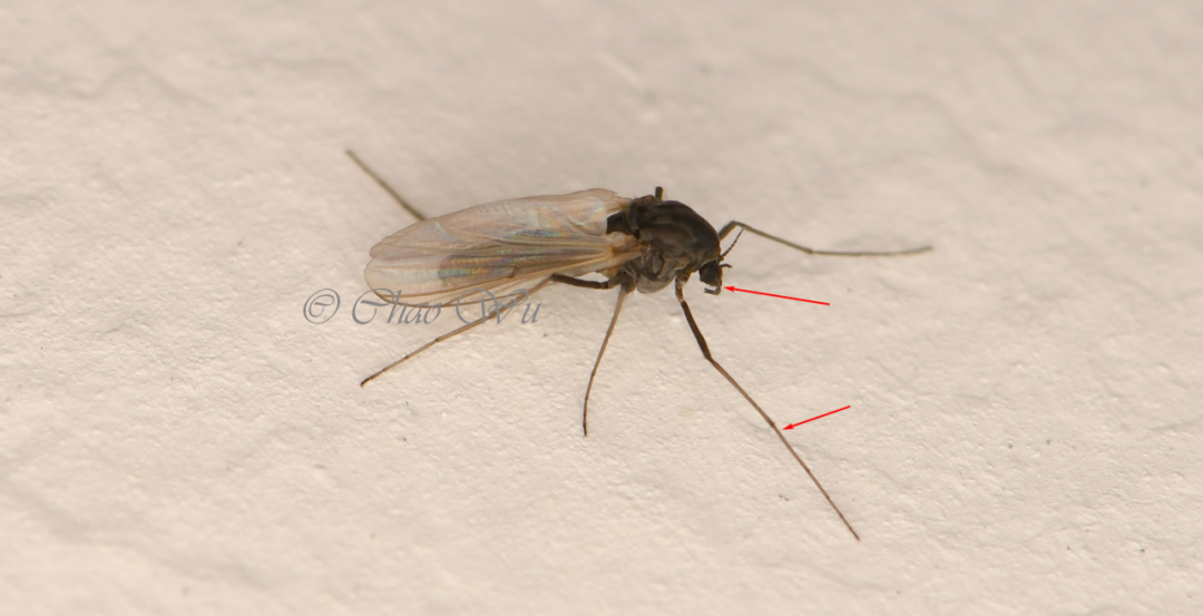 1.看前后足:在这些“蚊子”的六条腿中,摇蚊通常前足较长,而蚊科的“蚊子”后足较长。在停落时,摇蚊多用中后足支撑身体,而吸血的蚊往往用前中足支撑身体,而翘着后足。