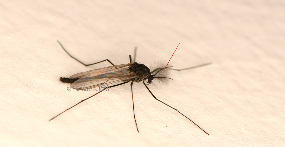 雄性的摇蚊,和雌性一样,没有针状的“嘴”,同时有着毛茸茸的触角。摄影:吴超