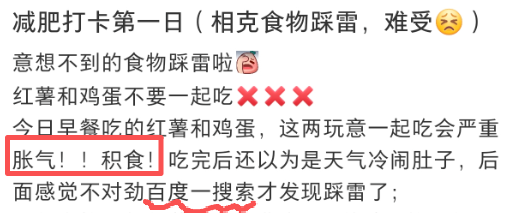 在一些社交平台上,搜索“红薯和鸡蛋不能一起吃”,就会看到有些用户现身说法,发帖分享自己的经历。比如早上吃了红薯和鸡蛋就肚子疼、腹胀、便秘……