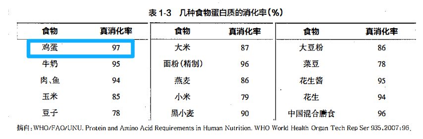 而鸡蛋不好消化就实属被冤枉了。鸡蛋中除了水分,含量最多的营养成分就是蛋白质,而鸡蛋蛋白是目前所有食物中,被公认最接近人体需求的[1],消化吸收利用率都是高于其他食物中的蛋白。