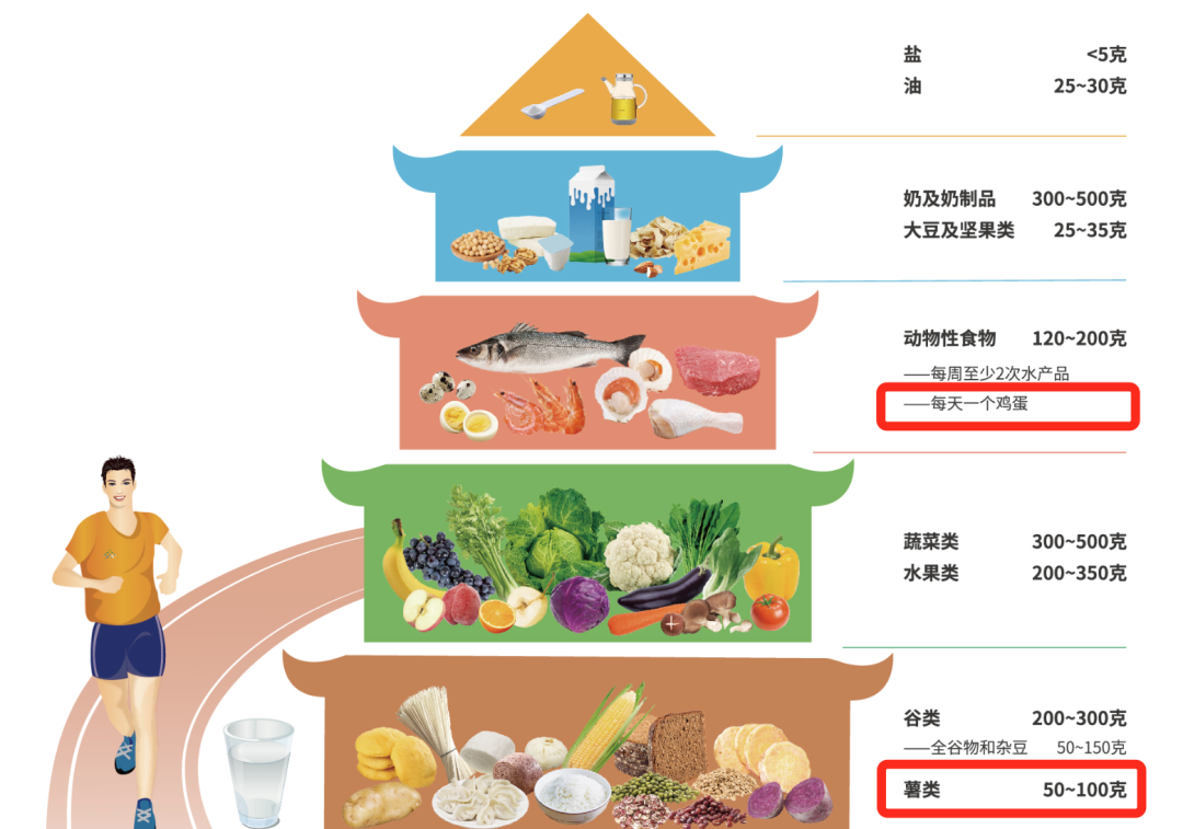 每种食物都有自己独特的价值,但食物多样、营养搭配才是王道。2022 版中国居民膳食宝塔建议,成年人每天吃 1 个鸡蛋,50~100g 薯类(生重)[2]。