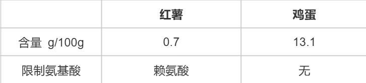 从含量上看,红薯的蛋白质含量较低,每 100g 只有 0.7g[4];鸡蛋的蛋白质含量高,每 100g 有 13.1g[5],在量上可以进行补充。