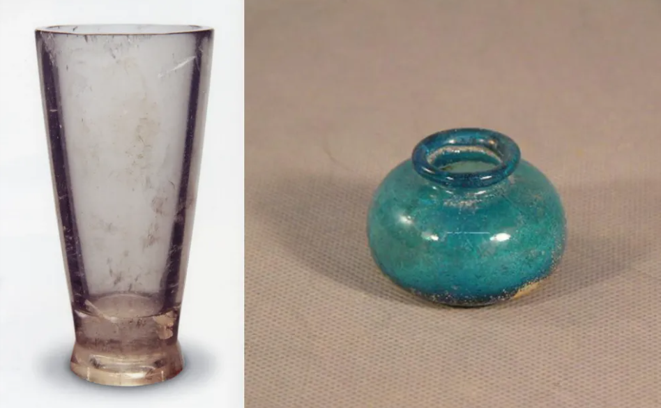 左:战国水晶杯右:北魏玻璃壶丨杭州博物馆、大同博物馆处理水晶指的是通过染色、辐照、加热、注胶、拼合等工艺改善外观的水晶。通常这些手段会导致颜色分布不自然,但其区分鉴别难度略高,因此需要具备仪器辅助和一定的经验。购买前不妨先大胆询问是否经过处理。
