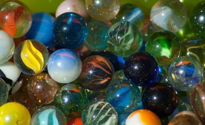 图一:塑料球;图二:玻璃球:图三和图四:不同颜色的萤石矿物,注意其形态和石英的差别丨wikipedia、pixabay