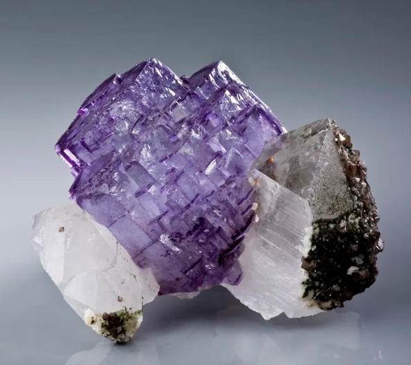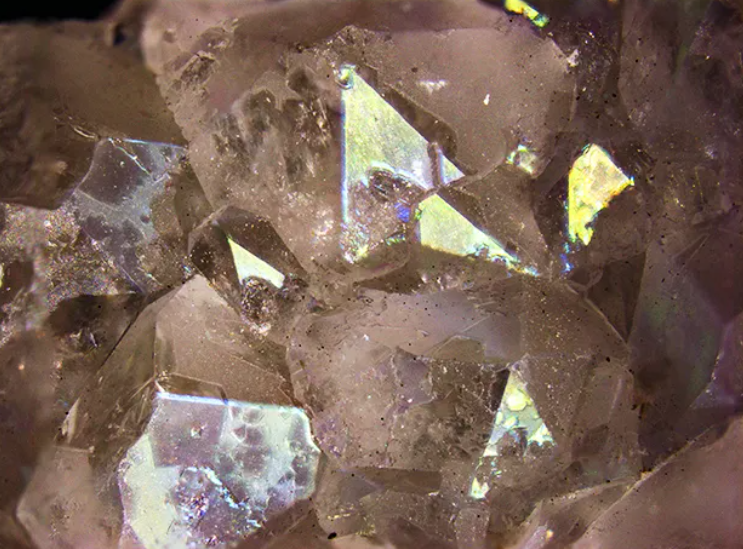 常见的白水晶是纯净的、没有缺陷的二氧化硅,当混入少量的二价铁(Fe2+)和铬(Cr)后形成绿水晶;混入致色元素二价锰(Mn2+)和四价钛(Ti4+)则呈现粉色,此时就是粉水晶/芙蓉石色;当其内部混入三价铁(Fe3+)元素、四价钛元素(Ti4+),并经历天然辐射形成色心,外表看起来就是紫水晶;而茶晶/烟晶是因为天然辐射激活了其中的铝(Al)色心。(色心,就是晶体内部形成了微小的晶格缺陷,它能选择性地吸收特定波长的可见光,从而使原本无色透明的晶体呈现出颜色。)