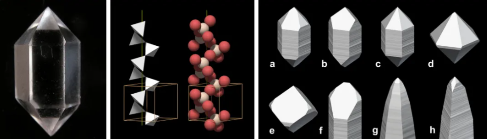 左图:产自意大利的水晶(石英)。中图:石英的分子结构,左侧为四面体模型,右侧为球状模型,其中红色球为氧原子,白色球为硅原子。右图:常见的石英晶形,注意其明显的锥状特征。丨参考文献[3]