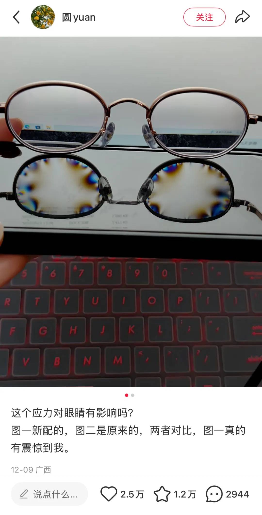 如果眼镜应力(内应力+装配应力)过强,尤其是应力不均匀,或者应力影响已经从周边蔓延到了视觉中心区域,那么可能会产生双折射现象。这个现象对大部分人来说,其实感觉并不明显,甚至大脑会自动修正这个微小的像差。但对于部分视觉敏感人群,则可能会觉得眼酸、胀痛,虽然看视力表是清楚的,但就是觉得哪里不对劲,甚至出现轻微的眩晕感。不过,目前没有应力造成视力下降的案例。