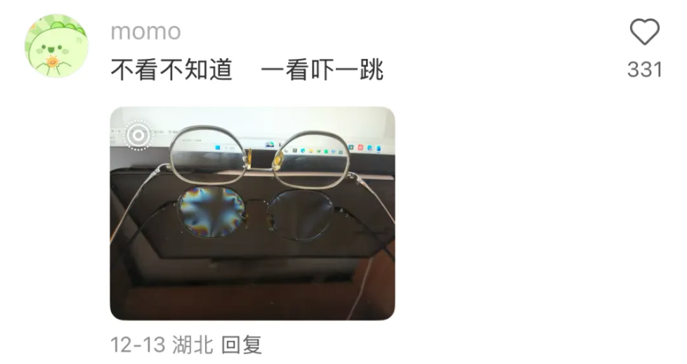 这是一位网友用网传的“镜片质量检测方法”,给自己的新眼镜做的检测。