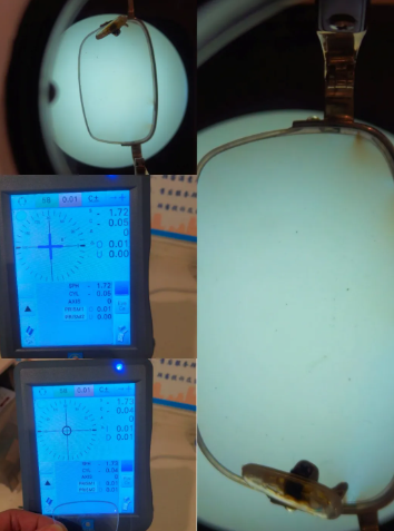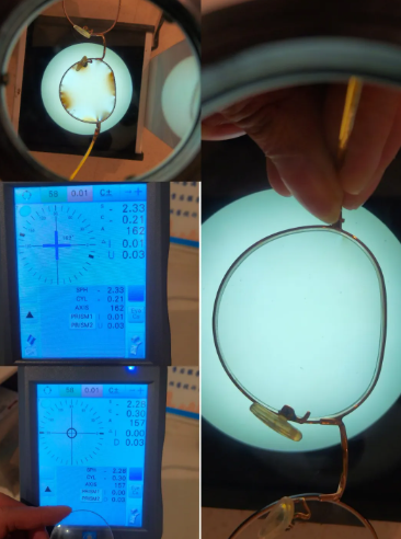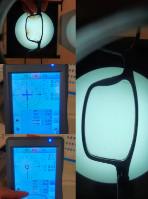每张图片所附的仪器数值图:上图为镜片装配在镜框内、受应力作用时的光度数值;下图为镜片从镜框中拆下、无外力施加时的光度数值(镜片光度是确定眼镜度数的核心参数)。