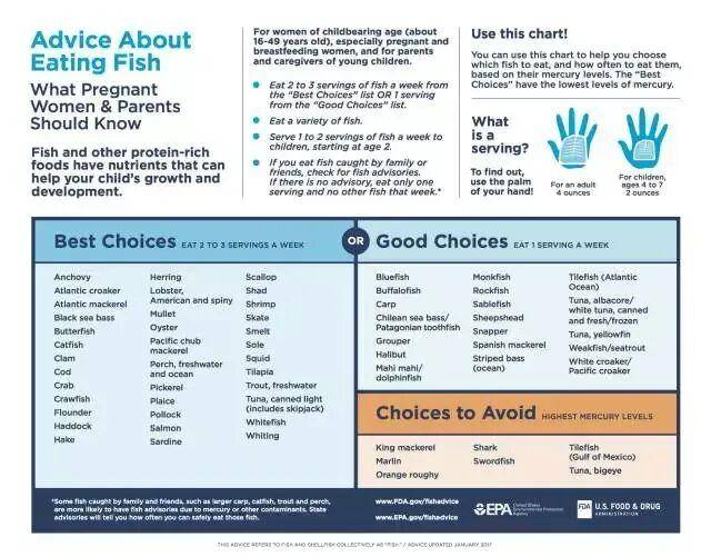 不少国家也针对这个问题给出了建议。例如,美国食品药品监督管理局对孕期和哺乳期妇女、婴幼儿、儿童等特殊人群给出了关于鱼的品种选择,以及食用量的建议。但并未提及“不吃鱼头、鱼皮”等。其列出的“不推荐”类别中,包含了鲨鱼、剑鱼、方头鱼、大耳马鲛鱼、大目金枪鱼、马林鱼等大型肉食性鱼类[14]。