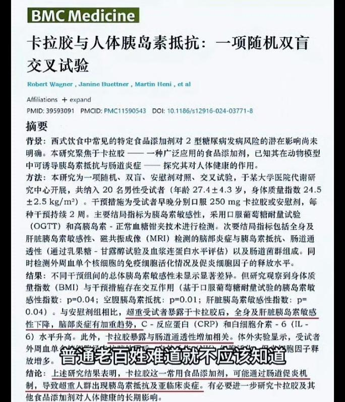 最近有个热搜说,“新研究发现:卡拉胶可能与胰岛素抵抗有关,尤其对超重人群影响更为明显”,不少解读直接得出结论“卡拉胶会导致胰岛素抵抗”“导致糖尿病”“减肥反弹全赖它的!”