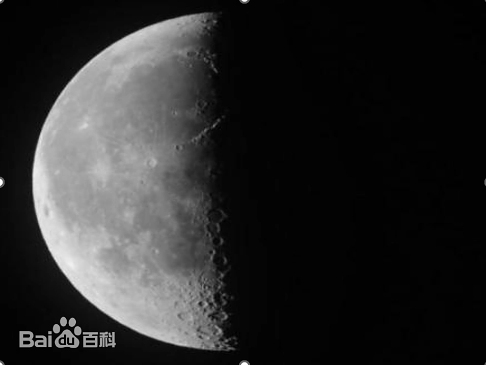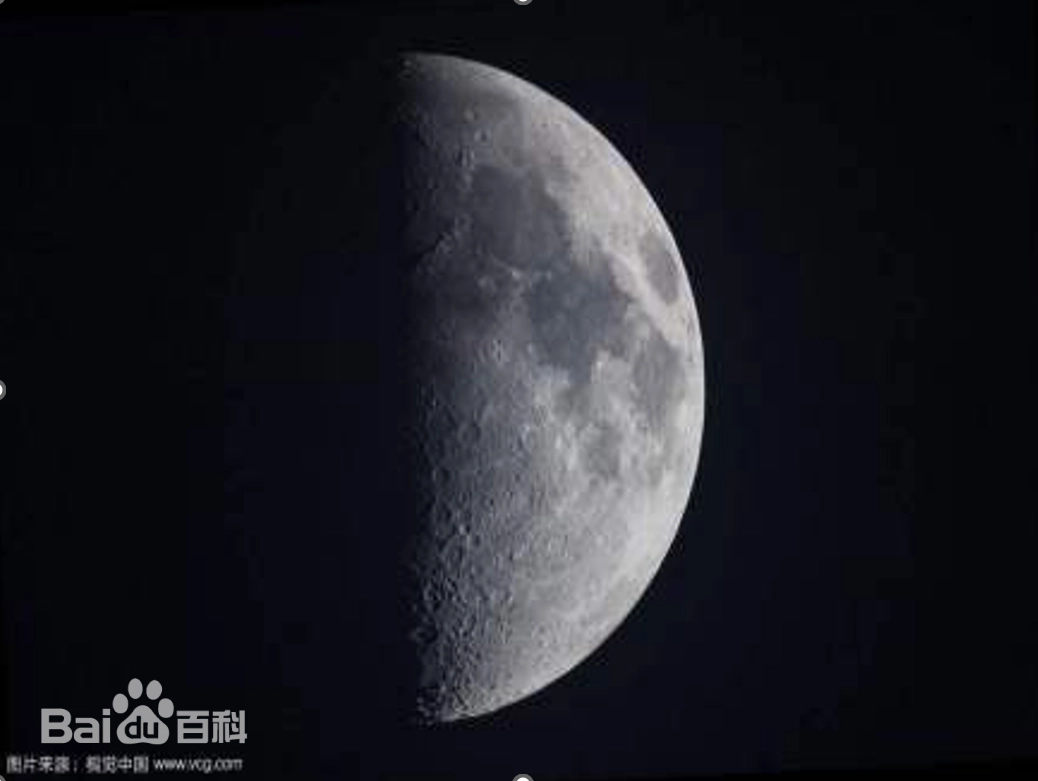 约在农历每月初七、初八,月球绕地球继续向东运行,月地连线与日地连线成90度。地球上的观察者正好看到月球是西半边亮,呈半圆形叫上弦月。假设观察者位于北半球中纬度,则上弦月约正午月出,黄昏时,它出现在正南天空,子夜从西方落入地平线之下。