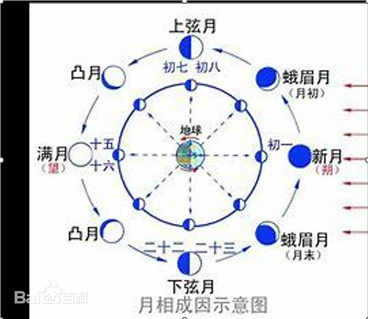 当地球位于月球和太阳之间时,我们可以看到整个被太阳直射的月球部分,这就是满月。当月球位于地球和太阳之间时,我们只能看到月球不被太阳照射的部分,这就是朔月;而当首度再见到月球明亮的部分时,称为“新月”。当地月联线和日地联线正好成直角时,我们正好可以看到月球被太阳直射的部分的一半,这就是上弦月。