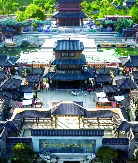 日影西移,董永七仙女文化园内忽起笙箫。汉服少女手持发绣团扇踏歌而行,扇面发丝细过蚕纱,这是“以发代丝”的东台绝艺。少女们云鬓高绾,乌发间金钗微颤。华灯初上,串场河夜游的灯影里,董永踏水而来,七仙女自塔顶垂裳起舞,缫丝井漾起粼粼蓝光。通圣桥畔忽现一列朱红仪仗,唢呐声里,新娘乘花轿过石桥,嫁衣上的并蒂莲纹随轿轻颤——这是古镇每日上演的传统婚巡。新人领罢婚书,必到老槐树下系同心锁。这株虬枝盘结的神木,被传为七仙女遗落的玉簪所化。