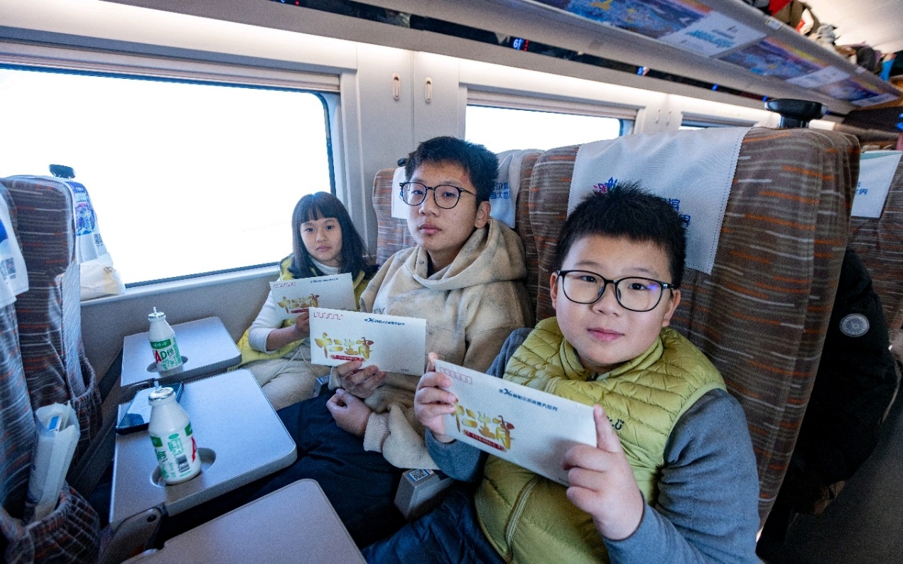 近日,哈尔滨冰雪大世界工作人员随车同行,化身“冰雪使者”,把来自北国的冰雪祝福送到旅客身边,将精心制作的“冰冰”“雪雪”玩偶、十二生肖冰雕明信片、高铁动车明信片等礼物赠予旅客。“太惊喜了,乘坐‘哈尔滨冰雪大世界’主题高铁列车,收到了礼物,哈尔滨真的太暖了。”收到礼物的旅客开心地说。